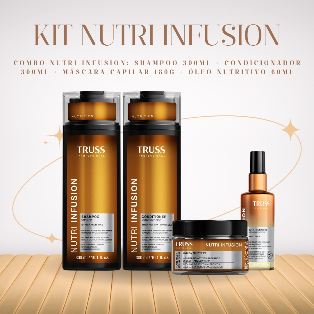 Kit de tratamento para cabelos secos ou ressecados. TRUSS Nutri Infusion Quarteto nutre e hidrata, restaurando brilho e maciez.
